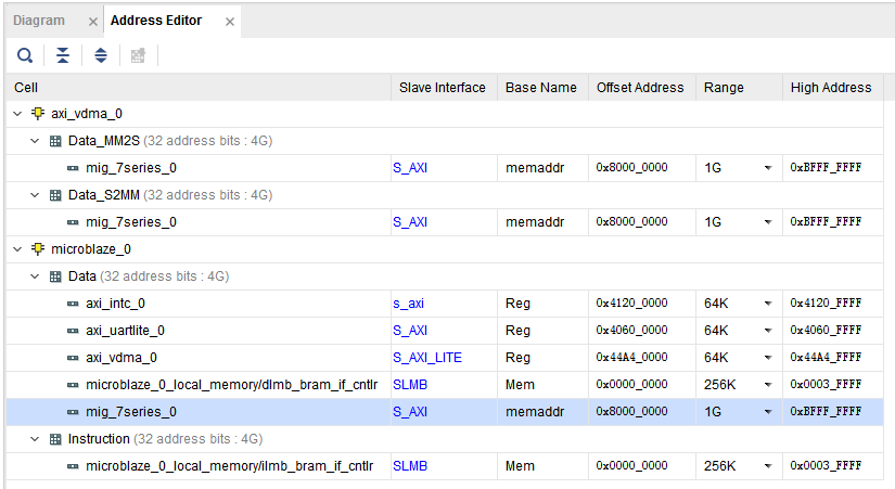 點(diǎn)擊BLOCK DESIGN開發(fā)界面下的"Address Editor"選項(xiàng),可查看IP核分配的地址,MicroBlaze可通過對(duì)應(yīng)地址對(duì)IP核進(jìn)行控制。
