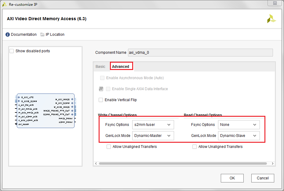 (5) 點(diǎn)擊Advanced,保持默認(rèn)配置,即可避免VDMA同時(shí)讀寫同一個(gè)Buffer,造成視頻數(shù)據(jù)傳輸亂碼。