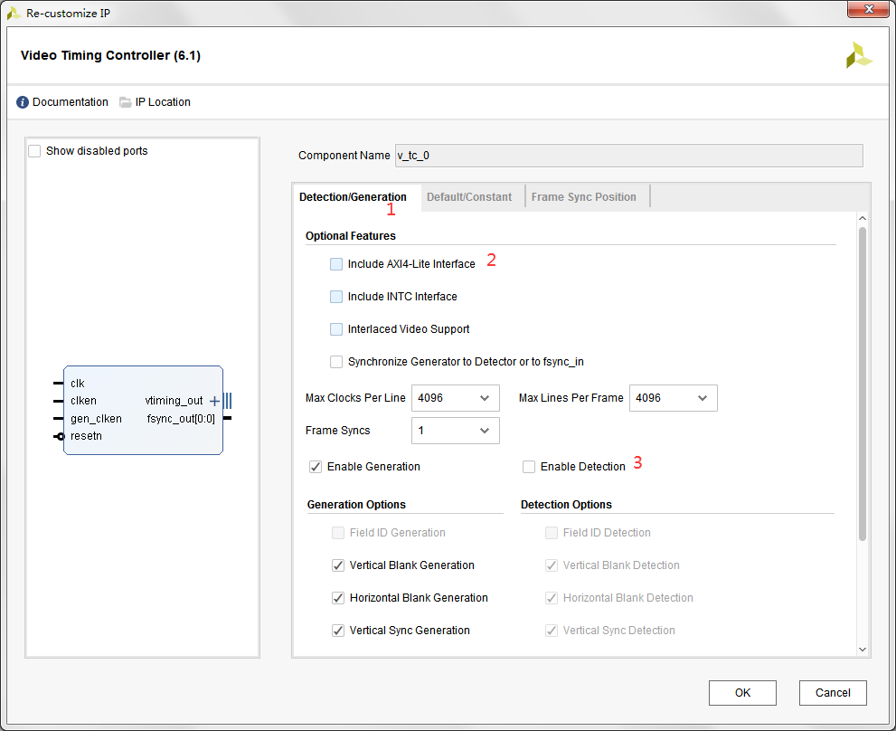 (1) 點(diǎn)擊Detection/Generation,確保不勾選"Include AXI4-Lite Interface"及"Enable Detection"。