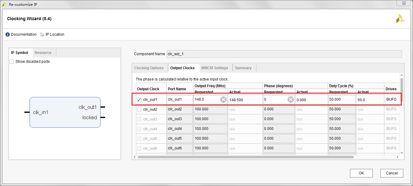 本案例使用Clocking Wizard IP核產(chǎn)生用于視頻輸出的像素時(shí)鐘(148.5MHz,對(duì)應(yīng)1080P60)。