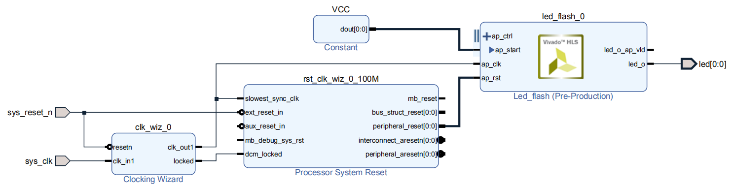 HLS工程配置的時(shí)鐘為100MHz,案例將該時(shí)鐘用于計(jì)算0.5s間隔時(shí)間進(jìn)行LED2亮滅狀態(tài)控制,生成的IP核亦需接入該時(shí)鐘。如需修改時(shí)鐘頻率,請(qǐng)打開HLS工程后點(diǎn)擊