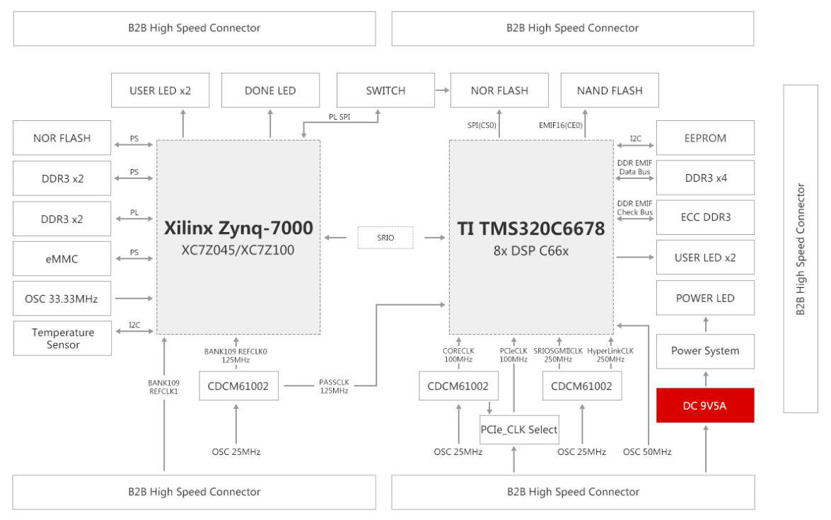 SOM-TL6678ZH是一款基于TIKeyStone架構(gòu)C6000系列TMS320C6678八核C66x定點/浮點DSP,以及Xilinx Zynq-7000系列XC7Z045/XC7Z100 SoC處理器設(shè)計的高端異構(gòu)多核工業(yè)級核心板。TMS320C6678每核心主頻可高達1.25GHz,XC7Z045/XC7Z100集成PS端雙核ARM Cortex-A9 + PL端Kintex-7架構(gòu)28nm可編程邏輯資源。核心板內(nèi)部DSP與ZYNQ通過SRIO通信總線連接,并通過工業(yè)級高速B2B連接器引出千兆網(wǎng)口、PCIe、HyperLink、EMIF16、USB、CAN、UART、GTX等通信接口。