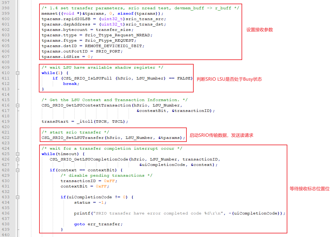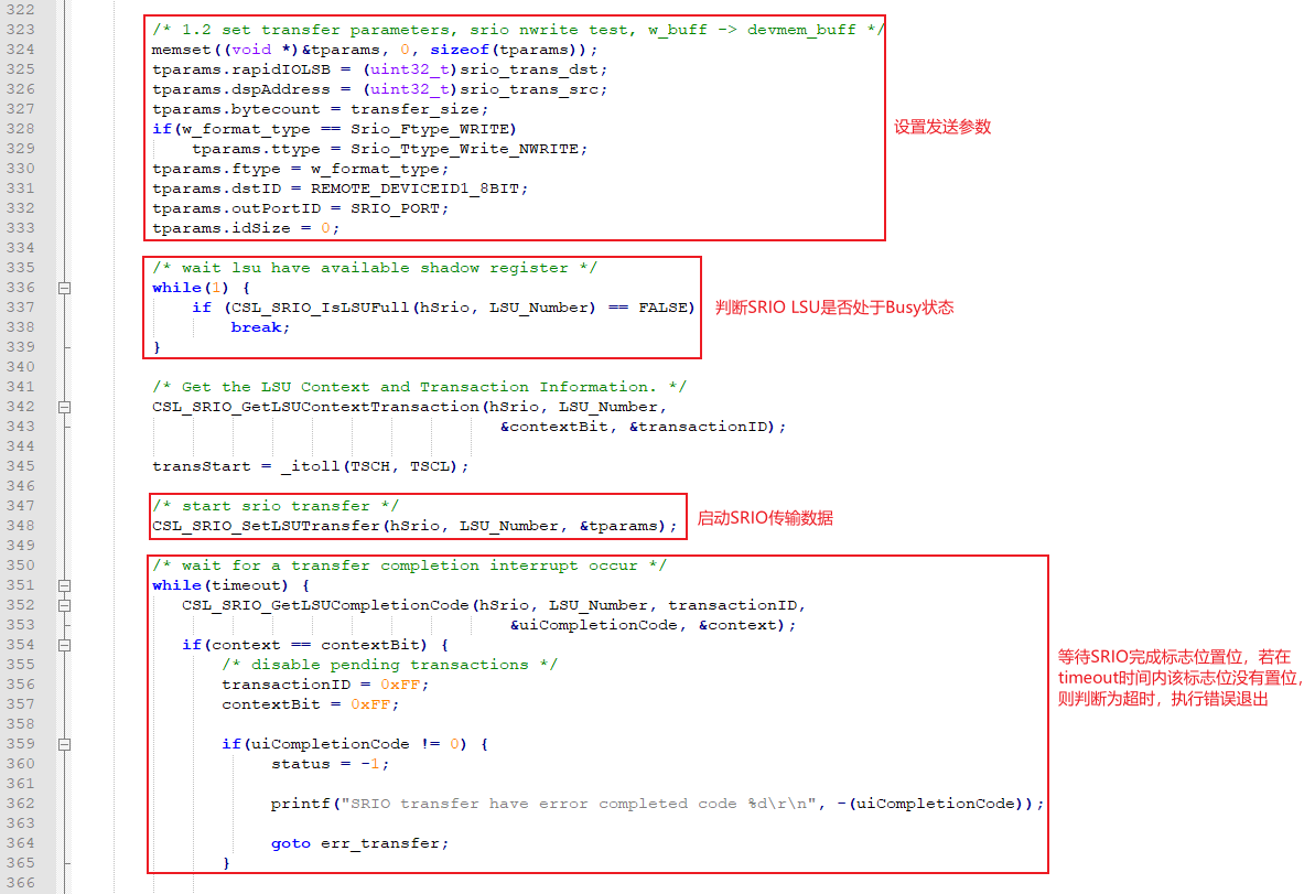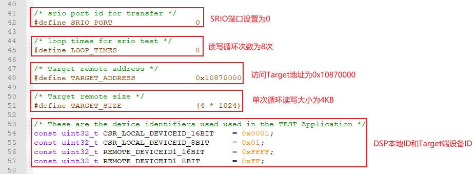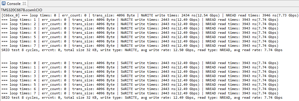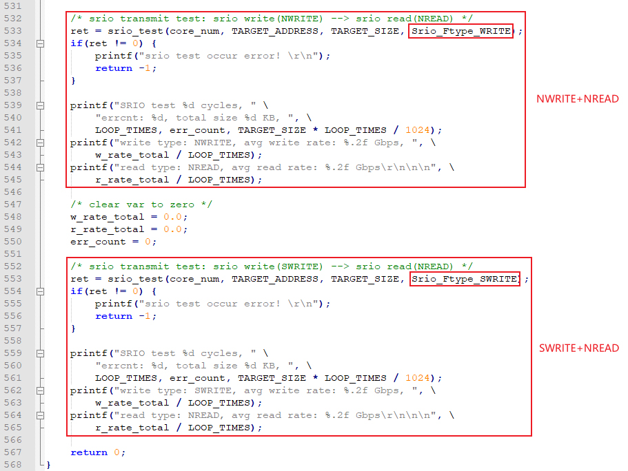 (3) 以NWRITE + NREAD和SWRITE + NREAD模式進行SRIO通信測試,單次讀寫大小為transfer_size,單位為Byte。w_format_type寫格式類型在main函數(shù)中調(diào)用srio_test()傳入。